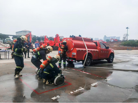 在中小型水罐消防车操作现场,参赛队员们迅速而准确地展开车辆操控,连接水源,调整水压,模拟对火源进行精准扑救。同时,一名队员时刻关注着火势变化,及时调整水炮角度和喷射力度,整个操作过程行云流水。