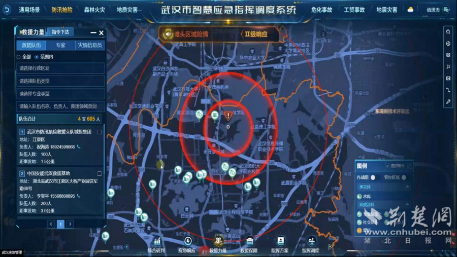 演练预设背景为我市连续遭遇强降雨,汤逊湖渔港路滩头区域险情突出,出现部分道路损毁、电网中断、管涌漫溢、群众被困等险情。武汉市应急管理局“智慧应急平台”根据预警、险情、灾情等情况,建议按照《武汉市城市防洪应急总体预案》要求启动防汛Ⅱ级响应,并生成抢险救援处置方案,武汉市防汛抗旱指挥部立即启动防汛Ⅱ级响应。