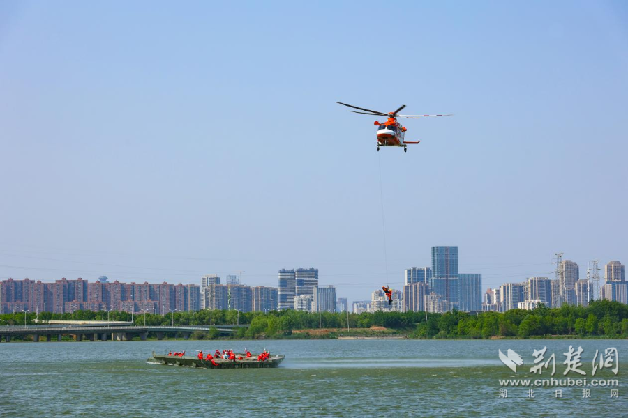 水域搜救环节,中国安能救援基地与国家华中区域应急救援中心机动队伍协同配合,组成动力舟桥和橡皮艇编队,开展人员搜救和转移行动。第二批群众转移时,一名群众突发昏迷,武汉市应急管理局调派直升机,开展直升机绳索救援,检验了“舟桥——空中”无缝对接的立体救援能力。